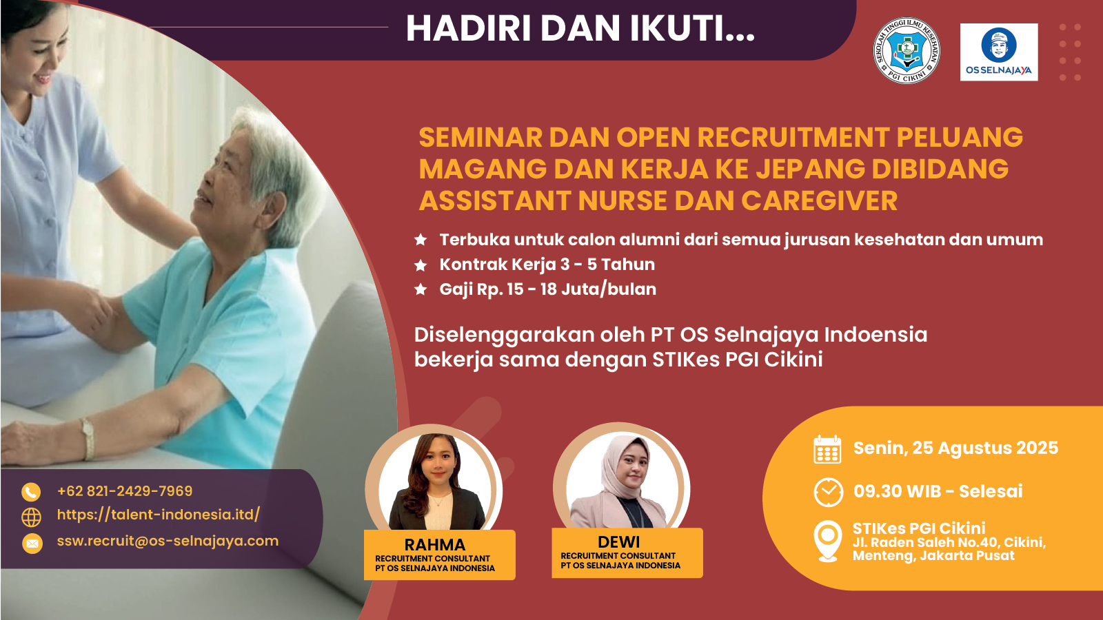 STIKes PGI Cikini bekerja sama dengan PT OS Selnajaya Indonesia sukses menggelar Seminar dan Open Recruitment Peluang Magang dan Kerja ke Jepang di Bidang Assistant Nurse dan Caregiver, yang diselenggarakan pada tanggal 25 Agustus 2025.